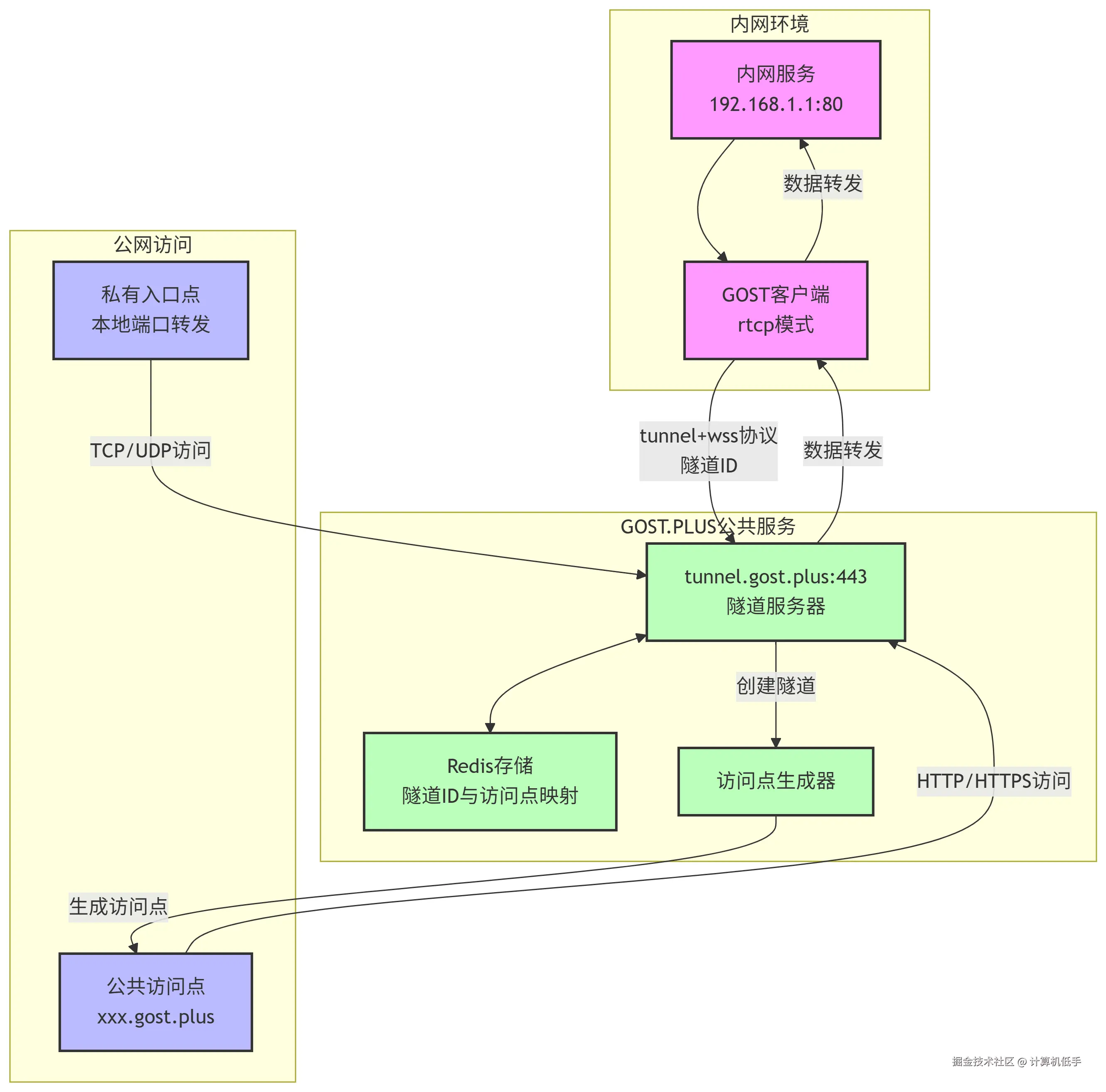 内网穿透系列六:GOST.PLUS实现多种协议穿透转发,代码开源支持私有部署 计算机低手 2025-06-15 238 阅读1分钟 以下是对GOST.PLUS的简单介绍: GOST.PLUS 是一个安全、易于使用的匿名公共反向代理隧道通信工具 提供可视化操作界面,只需简单点击即可立即将您的本地文件、Web 服务器和任何 TCP/UDP 服务共享到公共网络 客户端开源地址参考:github.com/go-gost/gos… 支持服务端私有部署与使用,参考:gost.run/blog/2023/g… 安装使用实操示例参考: 内网穿透系列六:GOST.PLUS实现多种协议穿透转发,代码开源支持私有部署