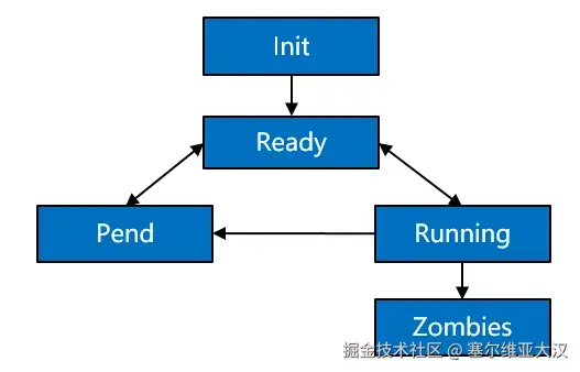 进程创建或fork时,拿到该进程控制块后进入Init状态,处于进程初始化阶段,当进程初始化完成将进程插入调度队列,此时进程进入就绪状态。