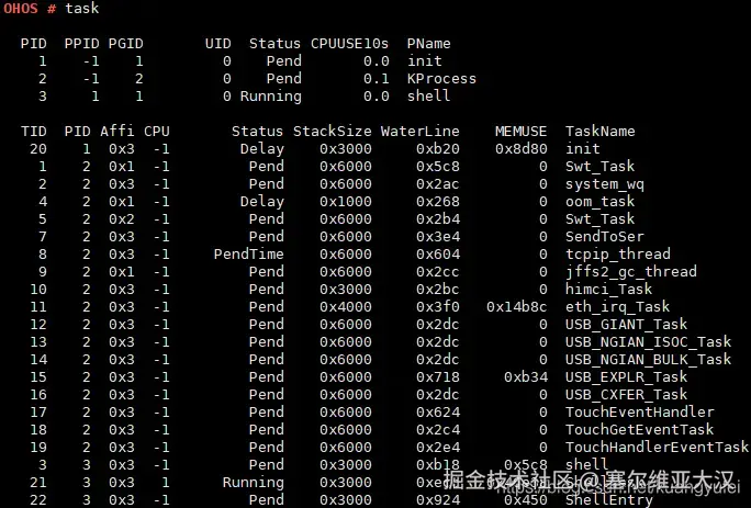 代码已经很清楚,创建了一个进程池,默认64个进程,也就是不改宏LOSCFG_BASE_CORE_PROCESS_LIMIT的情况下 系统最多是64个进程,但有两个进程先被占用,用户态和内核态各一个,他们是后续创建进程的根,所以最多留给外面的只有 62个进程可创建,代码的最后两个根进程的task阻塞链表被清空了,因为没有阻塞任务当然要清空.