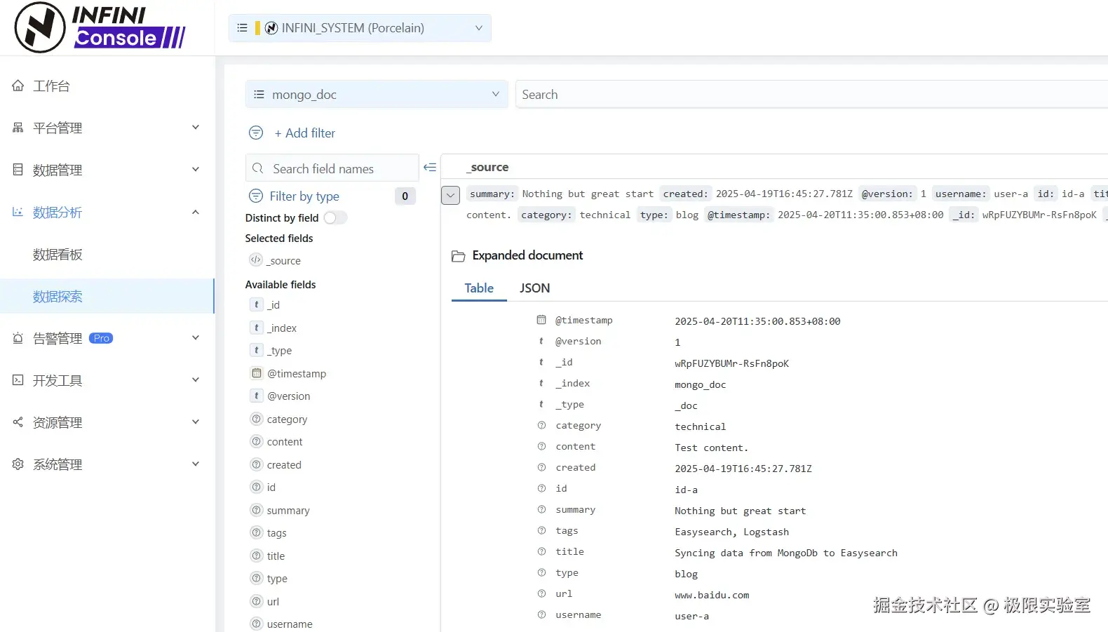 使用 INFINI Console 查看索引数据。可以看到目标数据已经成功迁移至 Easysearch。