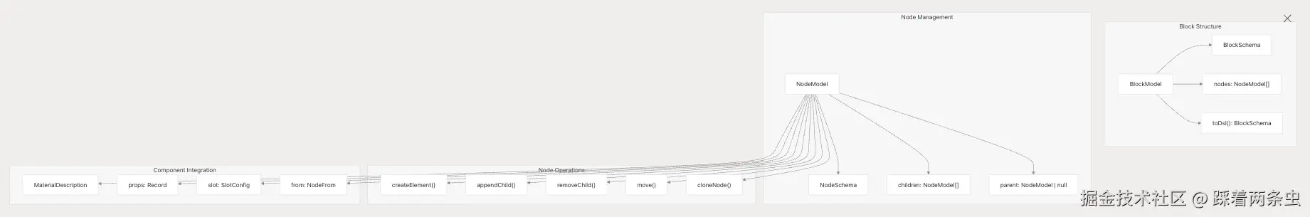 BlockModel 将单个组件或页面表示为 NodeModel 实例的树。该架构支持: