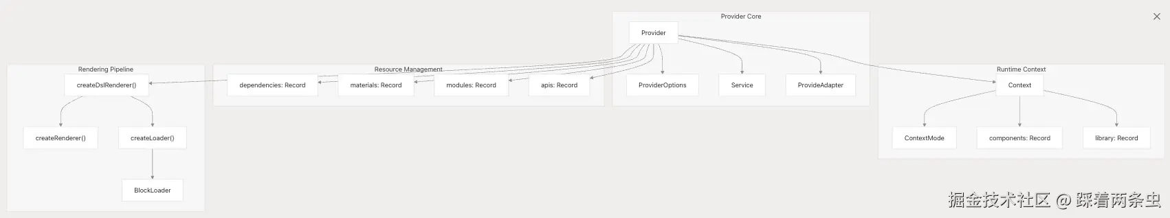 Provider 类跨不同执行模式(ContextMode.Design、ContextMode.Runtime、ContextMode.Raw)管理运行时服务和资源加载。关键架构模式包括: