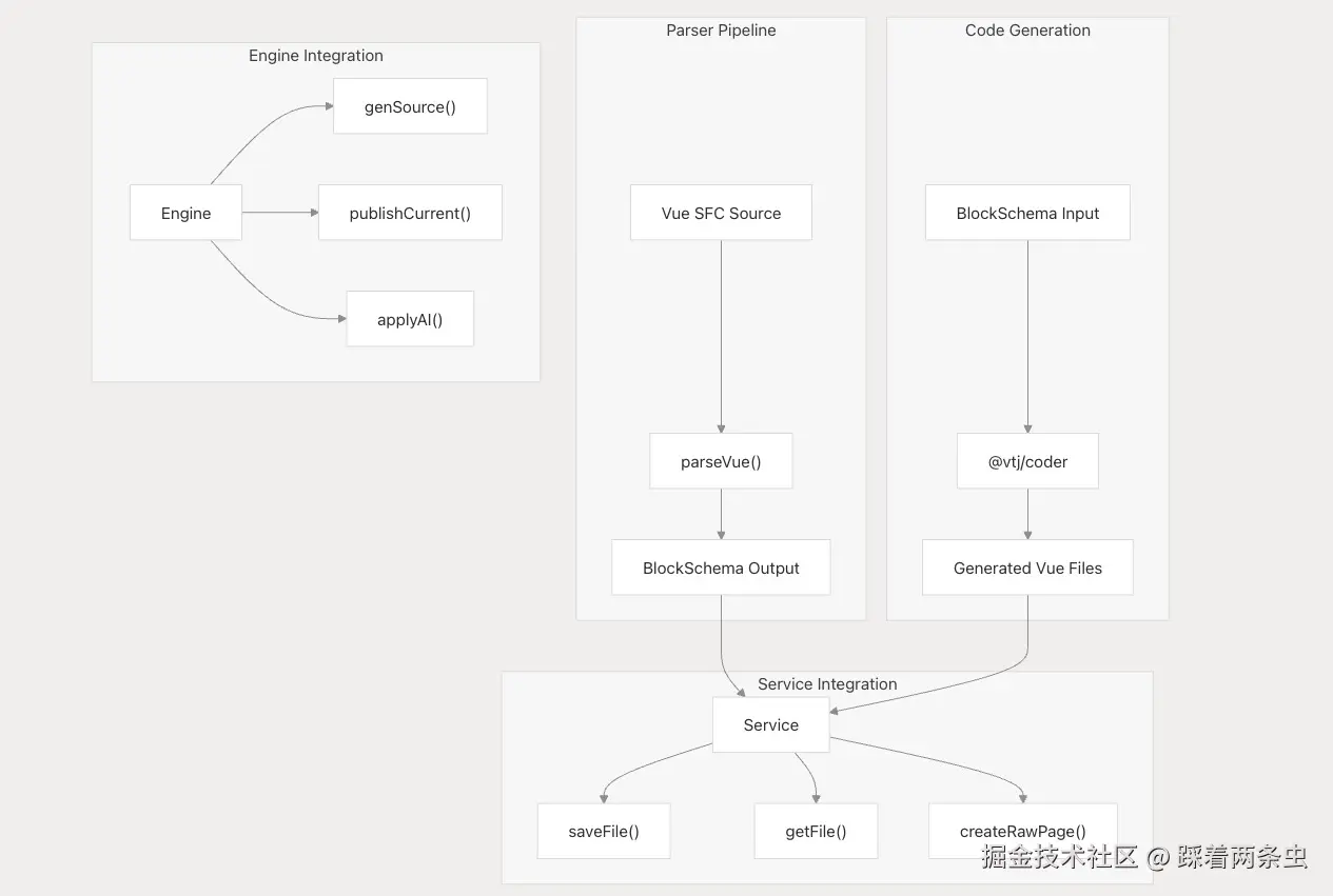 Engine.genSource() 方法编排完整的代码生成过程,而 createRawPage() 支持具有可视化组件和基于代码的组件的混合工作流。