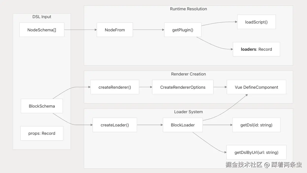 - DSL 加载 :createLoader 函数创建一个递归解析组件依赖关系的 BlockLoader