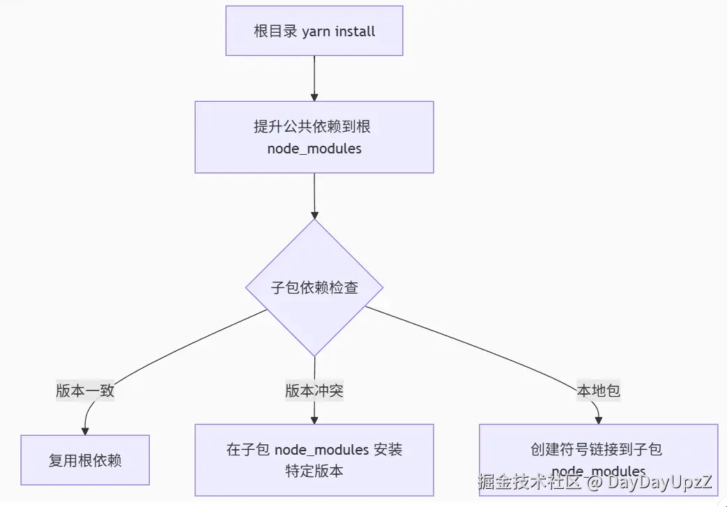 lodash@^4.17.21)被多个工作区包需要,并且版本范围兼容,Yarn 会尝试将这个依赖安装在根目录的node_modules中。这样,磁盘上只保留一份副本。 - 处理内部依赖: 如果包 B 的