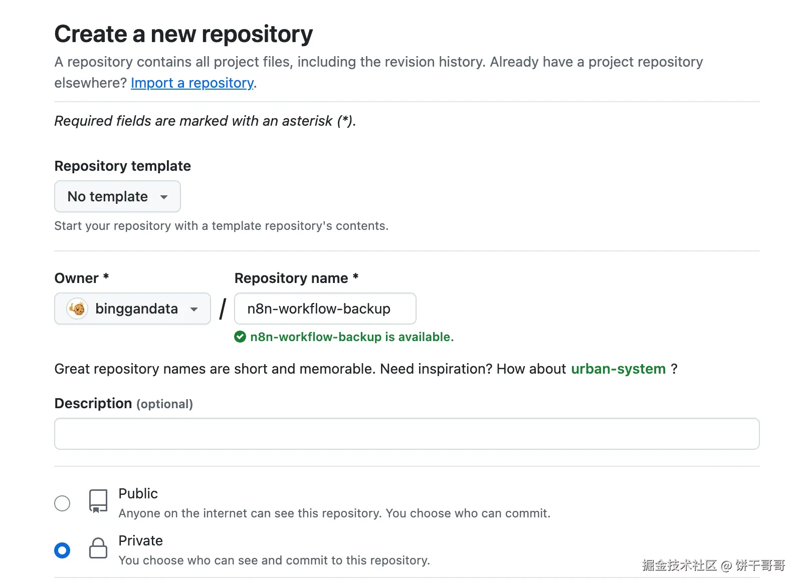 给仓库起个名字,例如**n8n-workflow-backup** ,这个记住,后面要用。