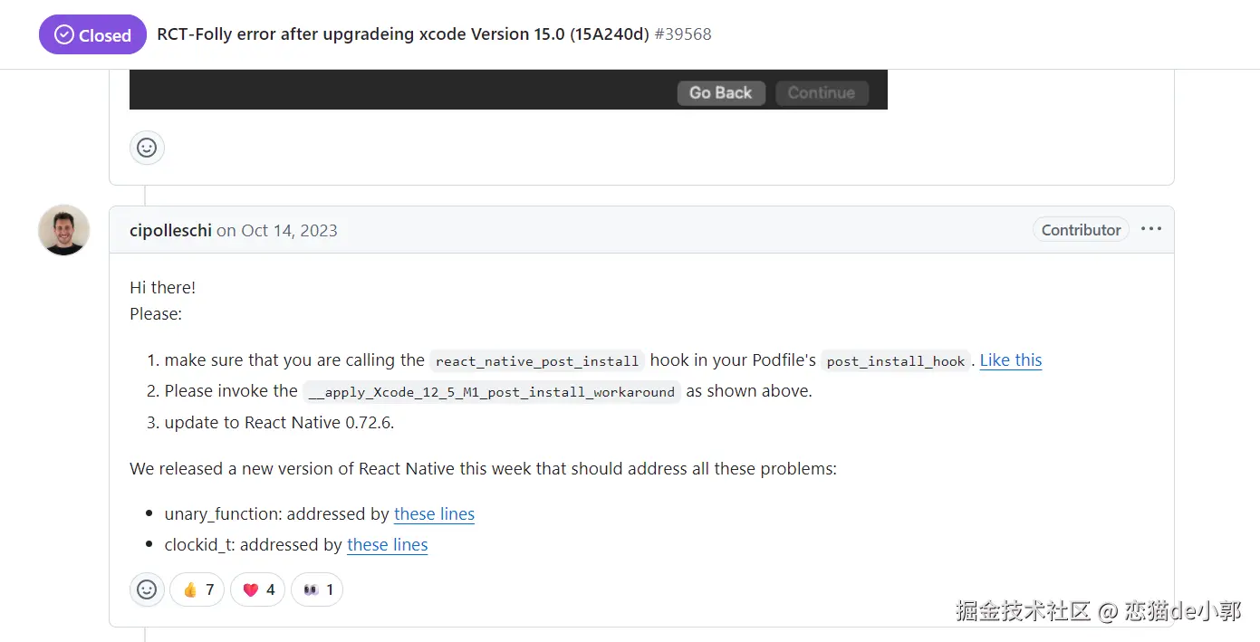 当然,更重要的是可以减少开发者的本地环境(如 Xcode 版本、Clang 版本、系统库、CocoaPods 版本等)带来的构建失败,毕竟在 React Native 社区里,用户报告的许多 iOS 构建问题主要源于第三方依赖项的编译失败或配置错误: