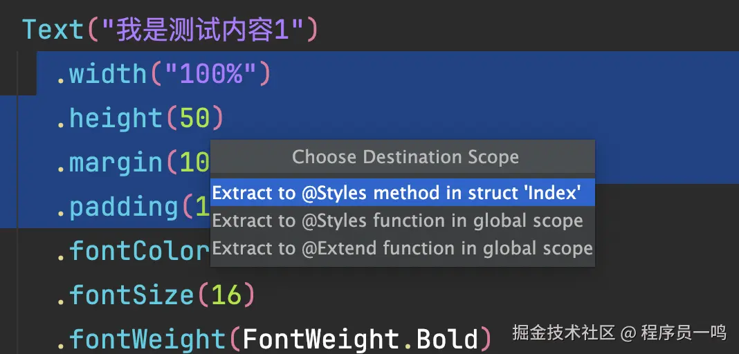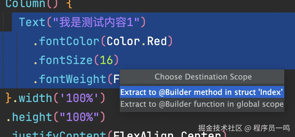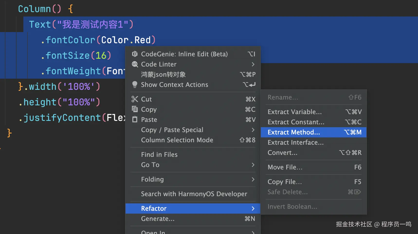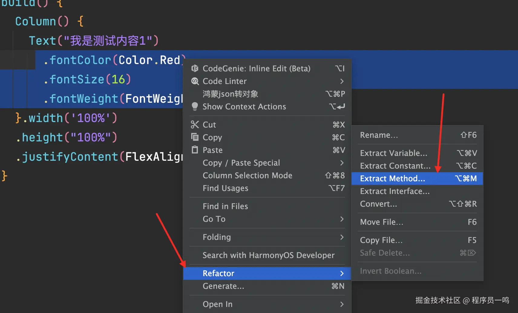 有这样的一个场景,当你初始写UI的时候,没有考虑到后面的代码复用,想要把一段重复的组件属性进行抽成一个方法?该如何快速的执行?再举一个常见的场景,一个函数,你写了很多的代码,想要把一部分代码,快速的抽成一个单独的函数,用于简化当前的代码逻辑,如何快速的实现?可能很多老铁会第一时间想到,把代码复制出来呗,这有什么难的?虽然手动复制出来可以实现,但是未免太浪费时间了,本篇文章就告诉大家一个便捷的方式来实现,那就是DevEcoStudio中的代码提取。