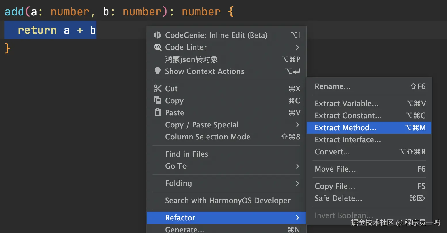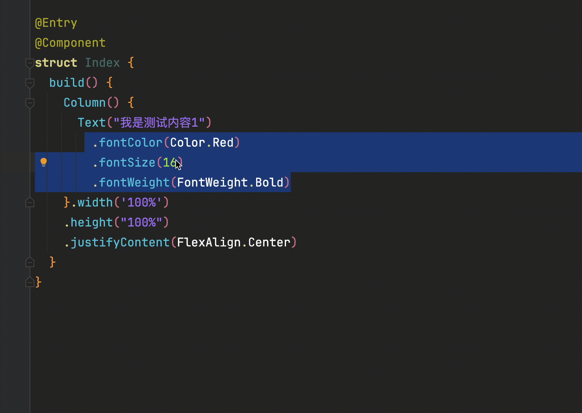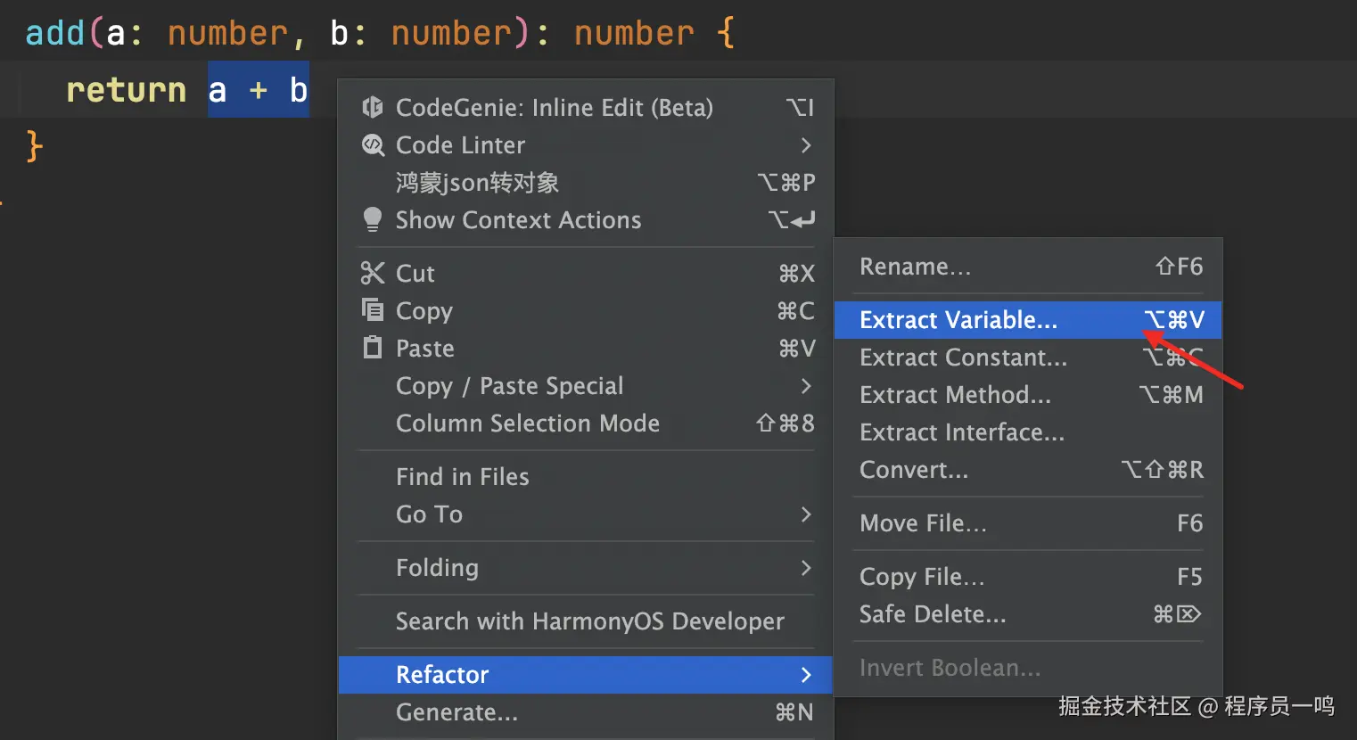 有这样的一个场景,当你初始写UI的时候,没有考虑到后面的代码复用,想要把一段重复的组件属性进行抽成一个方法?该如何快速的执行?再举一个常见的场景,一个函数,你写了很多的代码,想要把一部分代码,快速的抽成一个单独的函数,用于简化当前的代码逻辑,如何快速的实现?可能很多老铁会第一时间想到,把代码复制出来呗,这有什么难的?虽然手动复制出来可以实现,但是未免太浪费时间了,本篇文章就告诉大家一个便捷的方式来实现,那就是DevEcoStudio中的代码提取。