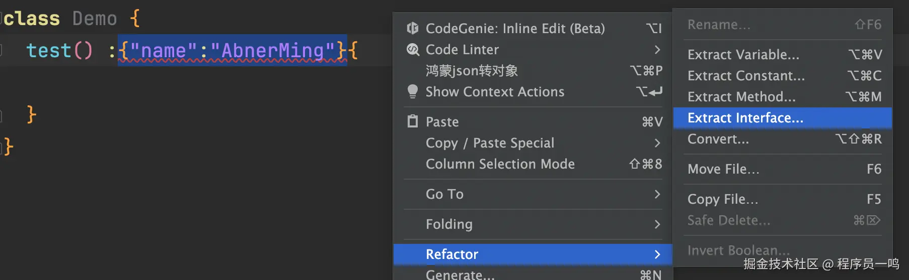其实我们看到,还有一个接口提取,也就是支持选中对象自变量进行提取成接口,使用方式如下: