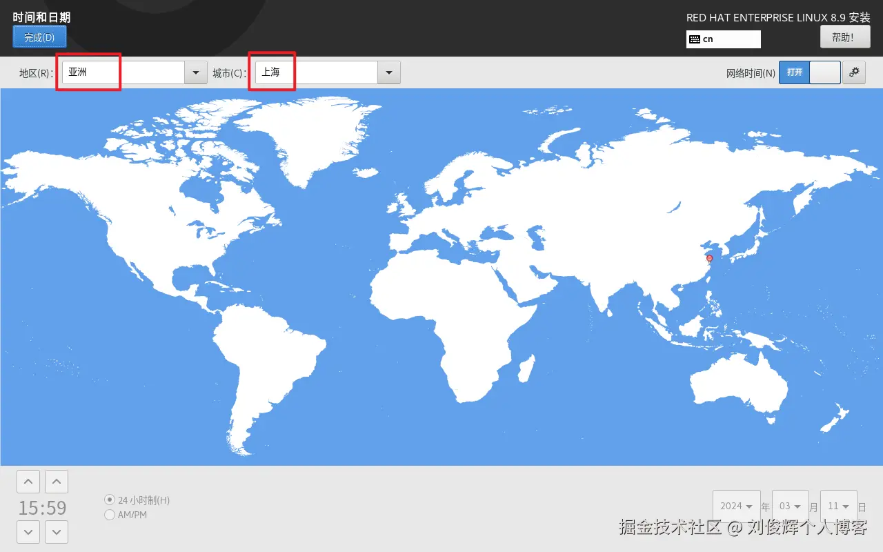 - 选择“时间和日期”命令,设置时区为亚洲/上海,单击“完成”按钮返回RHEL 8系统安装主界面。