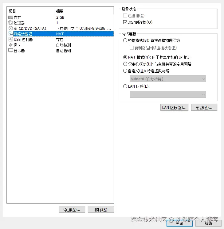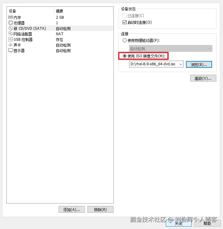 - 光驱设备此时应在“使用ISO映像文件”中选中了下载好的RHEL系统映像文件,如下图所示。