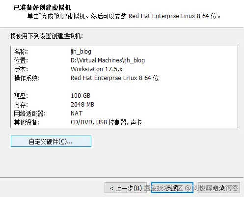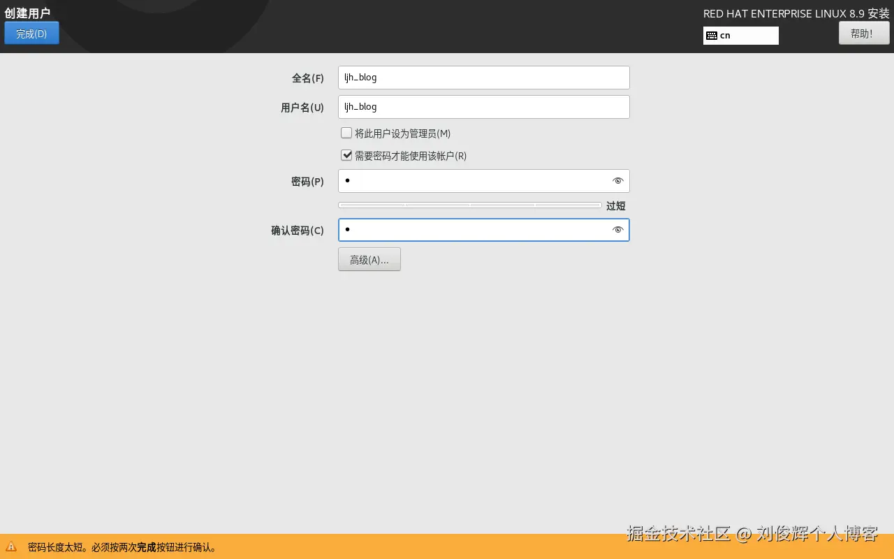 - 返回到安装主界面,单击“创建用户”按钮后新建普通用户,例如该账户的用户名为“ljh_blog”,密码为“1”,然后单击两次“完成”按钮。如图下所示。