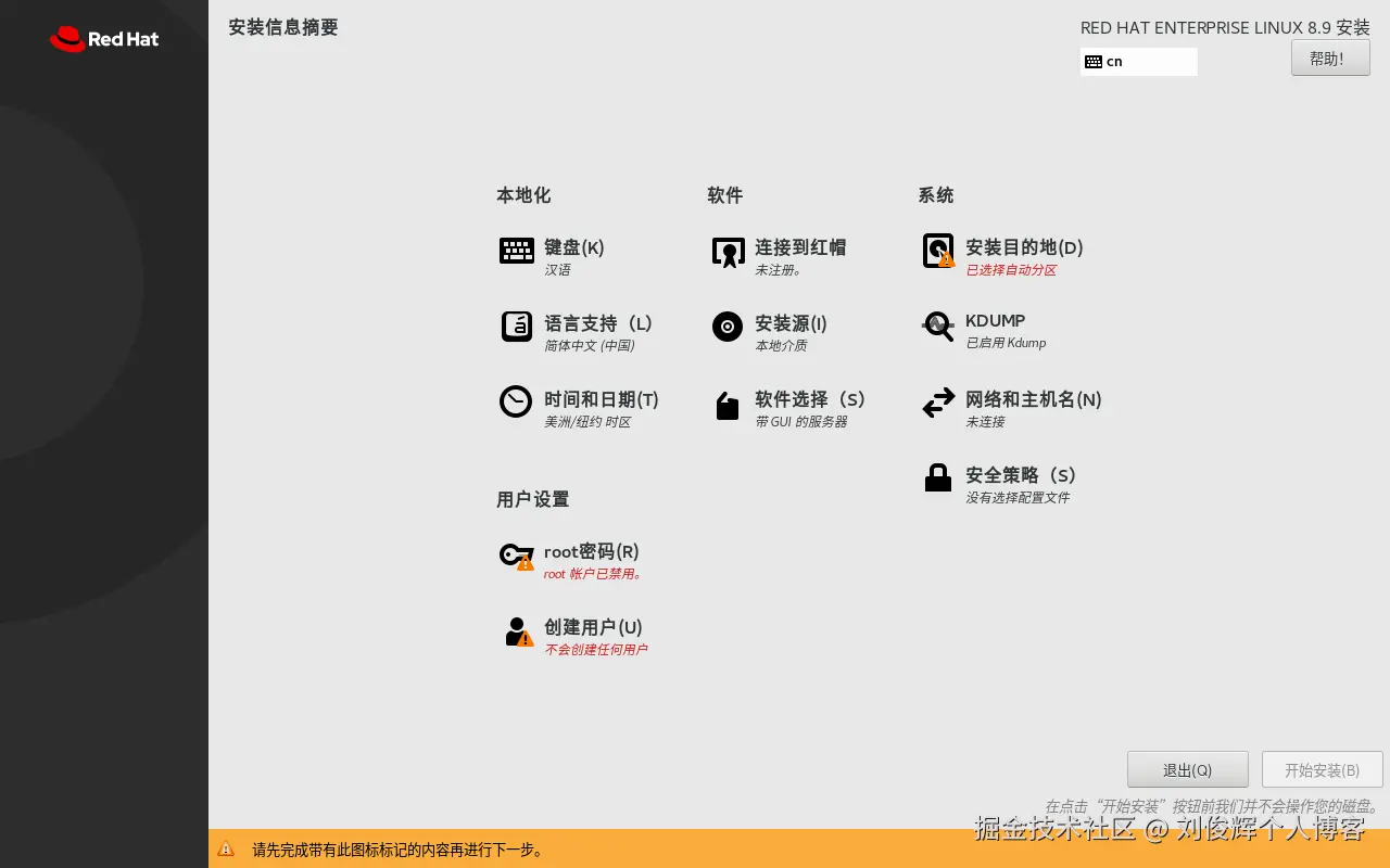 - 下图所示为安装信息摘要界面,"软件选择"按系统默认值,不必更改。RHEL8系统已默认选中“带GUI的服务器”单选按钮(如果不选此项,则无法进入图形界面),可以不做任何更改。