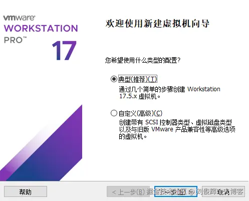 - 在上图所示的界面中,单击“创建新的虚拟机”选项,并在弹出的“新建虚拟机向导”界面中选择“典型”单选按钮,然后单击“下一步”按钮,如下图所示。