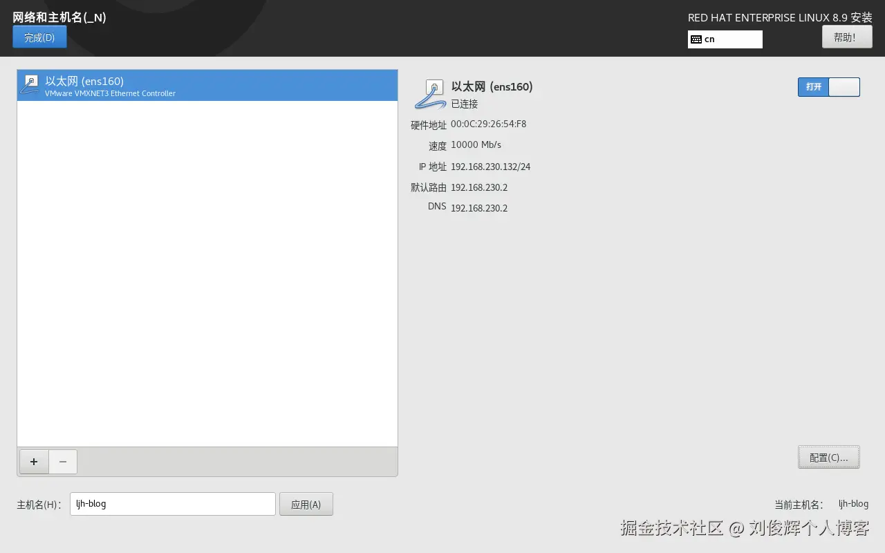 - 单击“网络和主机名”选项后,将“主机名”字段设置为ljh-blog,将以太网的连接状态改成“打开”状态,然后单击左上角的“完成”按钮,如下图所示。