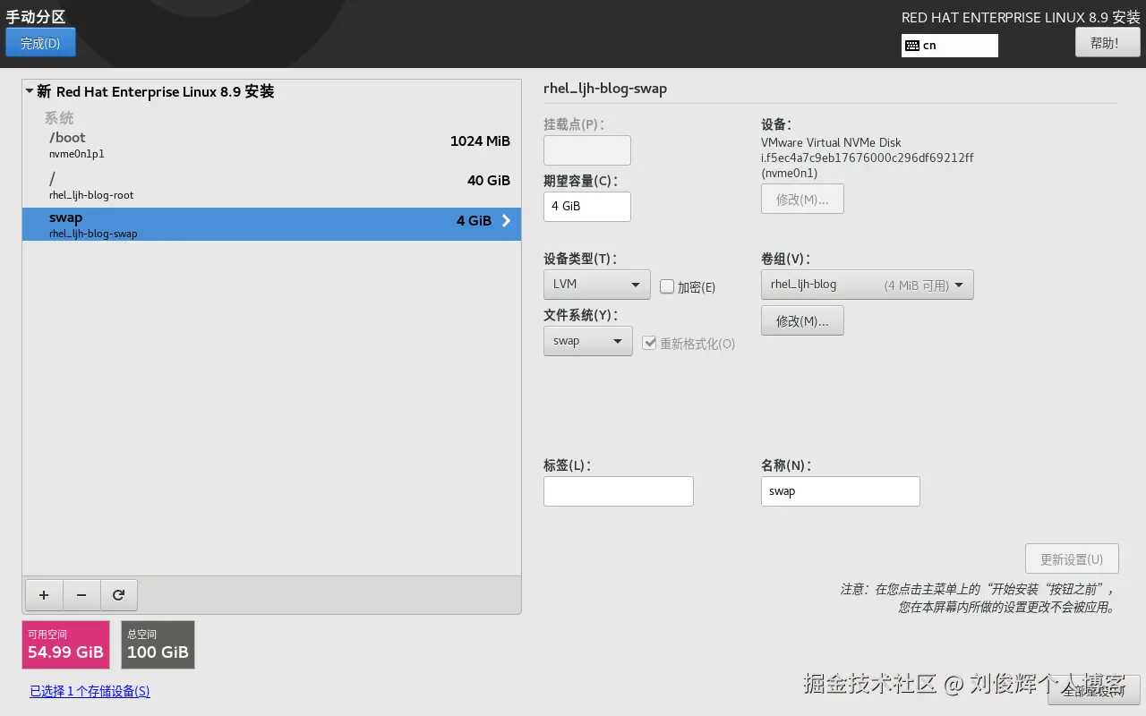 - swap分区大小为4GiB