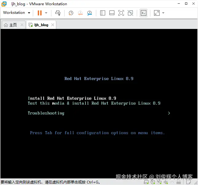 - 在虚拟机管理界面中单击“开启此虚拟机”按钮后数秒就看到RHEL8系统安装界面,如下图所示。在界面中,“Test this media & install Red Hat Enterprise Linux 8.9”和“Troubleshooting”的作用分别是校验光盘完整性后再安装以及启动救援模式。此时通过键盘的方向键选择“Install Red Hat Enterprise Linux 8.9”选项来直接安装Linux系统。