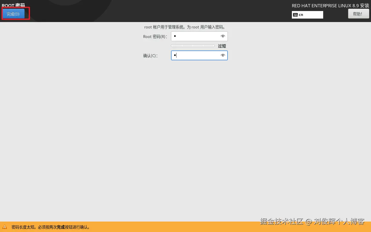 注意:在虚拟机中做实验的时候,密码无所谓强弱,但在生产环境中一定要让root 管理员的密码足够复杂,否则系统将面临严重的安全问题。