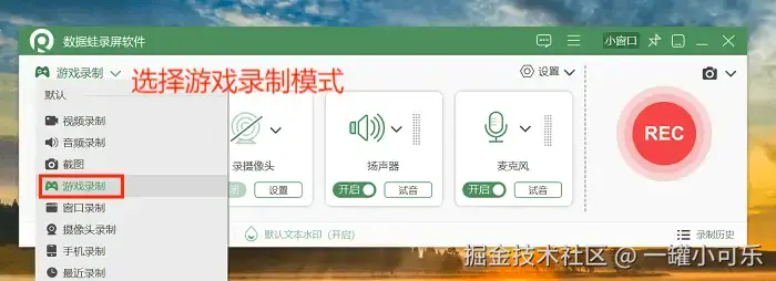 步骤2:在游戏录制模式中,选择需要录制的游戏区域后,自由选择录制的音频源,还可以开启水印录制哦。设置完毕后点击 “REC” 开始录制游戏。