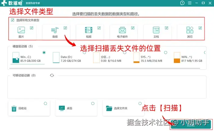 第1步: 在电脑中打开数据 蛙恢复专家,在软件的首页上选择需要扫描的文件类型,再选择需要扫描的电脑位置,点击【扫描】;