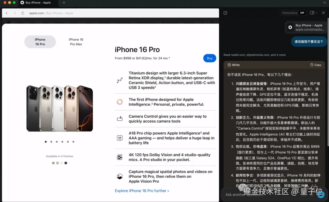 这不,为了避免剁手,让 AI 劝我一下别买 iPhone 16 Pro(doge)。