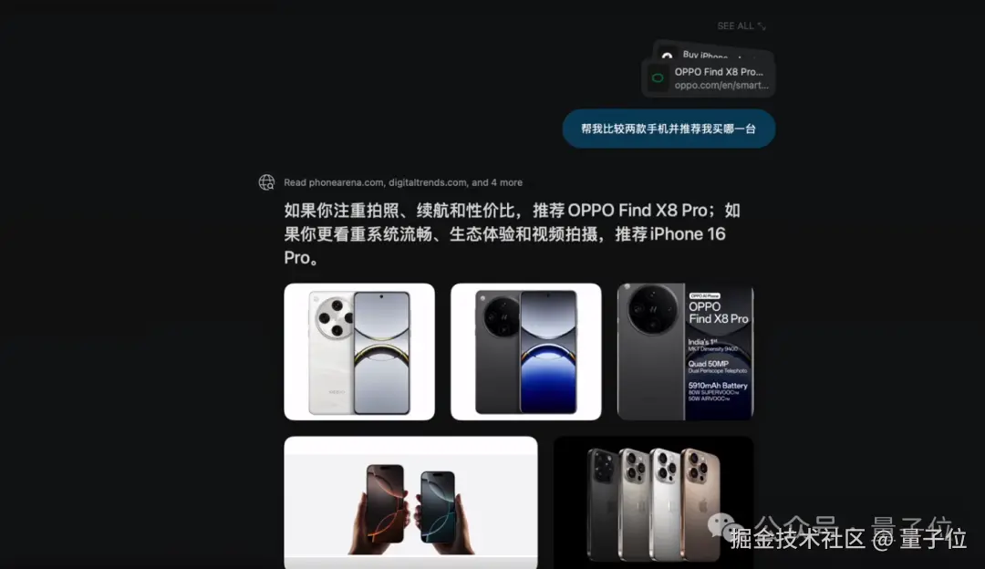 还能一键比较两个不同网页的内容,帮我们无痛选择发售日期相近的两款手机_(iPhone 16 Pro 和 OPPO Find X8 Pro)_: