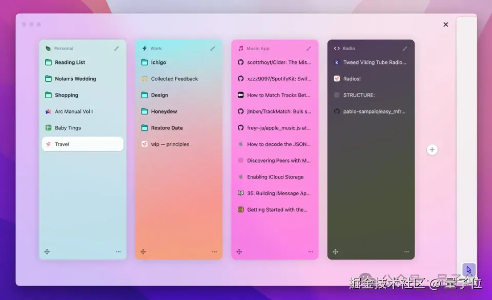 比如它始终强调层级和竖向排列,针对用户需要经常打开多个网页导致混乱的痛点,Arc 推出了空间 “space” 这一概念,这些分门别类的浏览器空间能满足用户个人、工作、学习、娱乐等不同场景的需求。