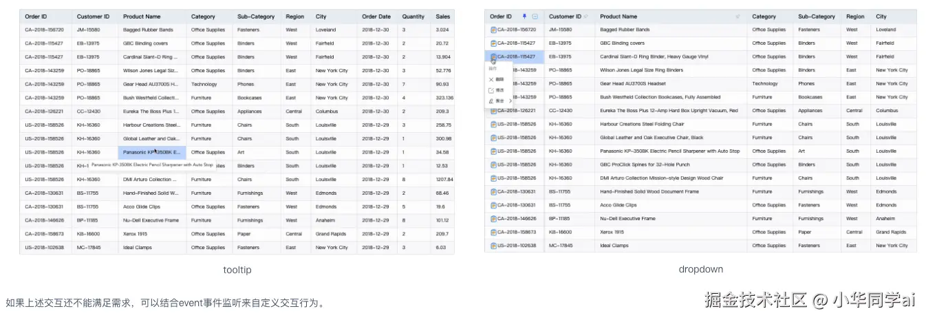 | 强交互能力 | 支持选择、框选、列拖拽、排序、冻结列、列宽调整、hover 高亮、tooltip 与 dropdown 等 |