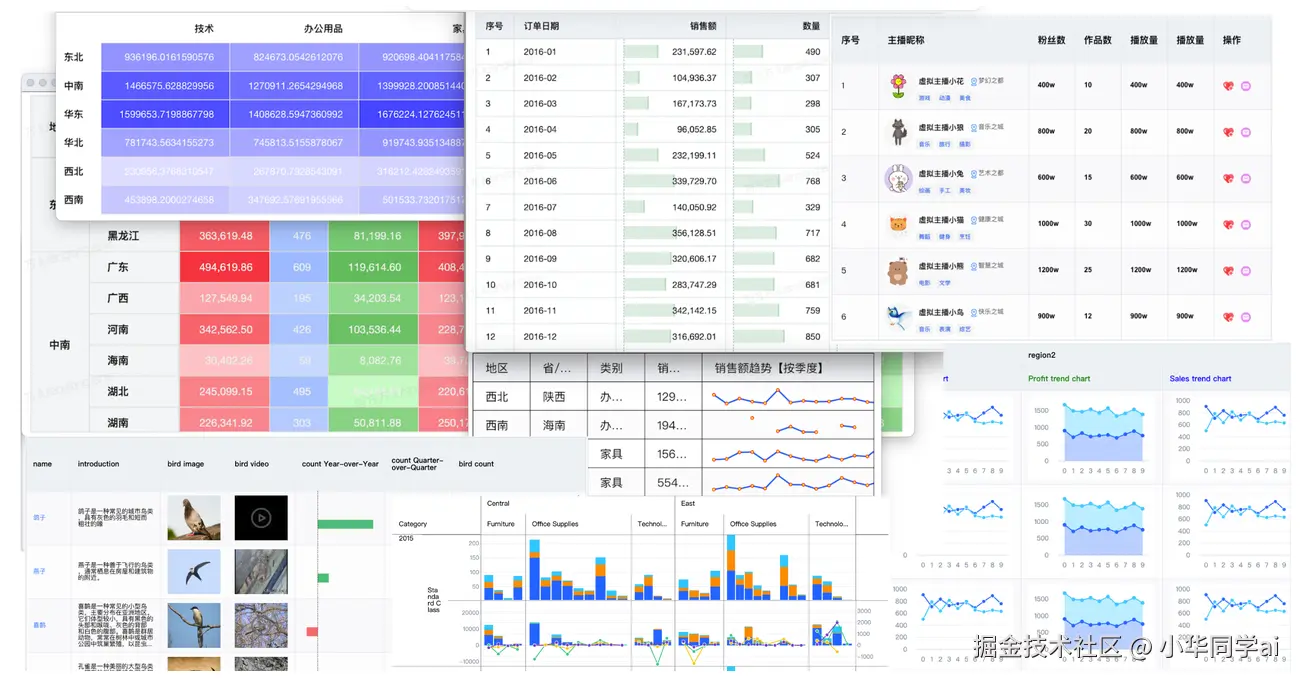 | 丰富单元格展示 | 支持 text/link/image/video/sparkline/progressbar/chart,轻松做数据可视化 |