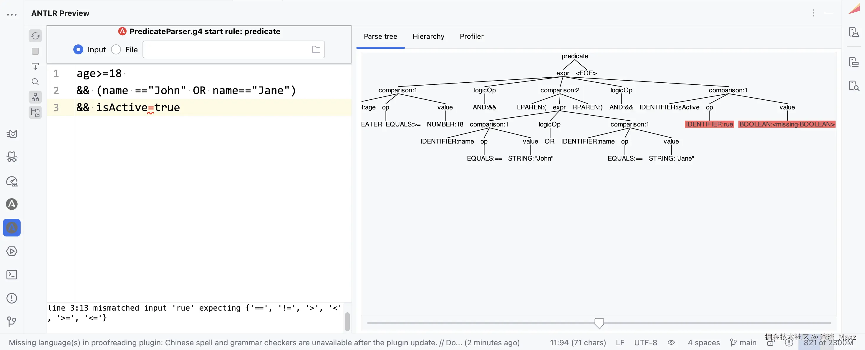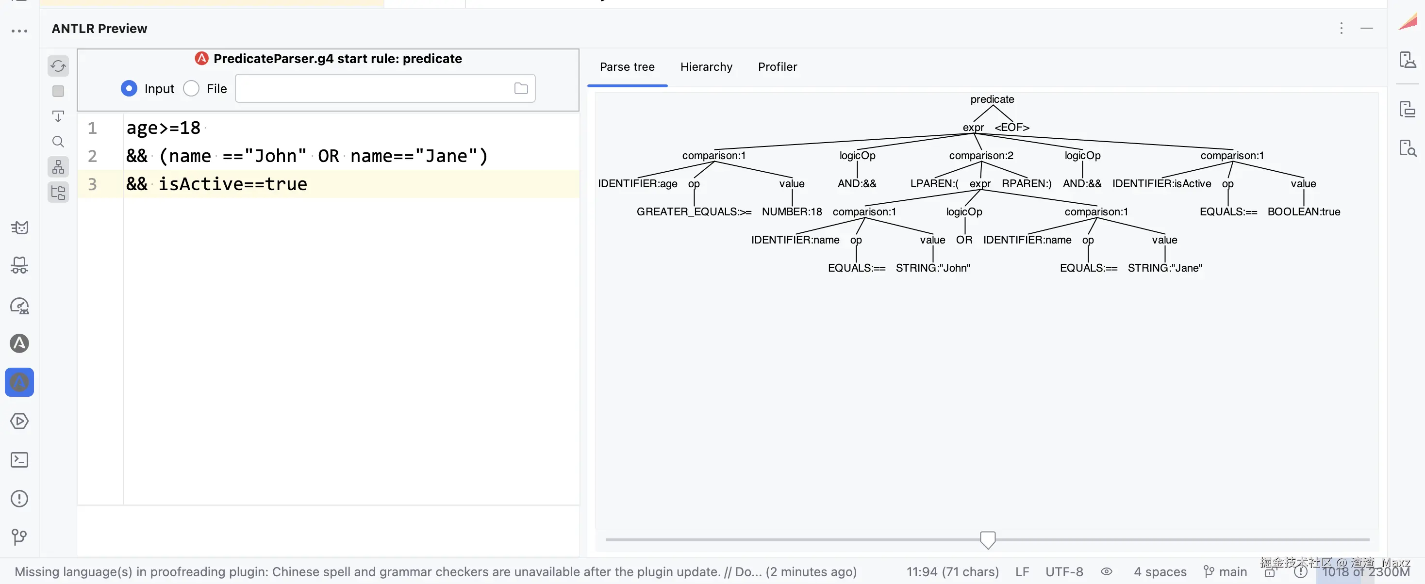 定义好之后,我们首先可以安装一个ANTLR的插件,然后我们就可以先在插件提供的窗口中,查看整体解析的正确与否以及解析完的语法树