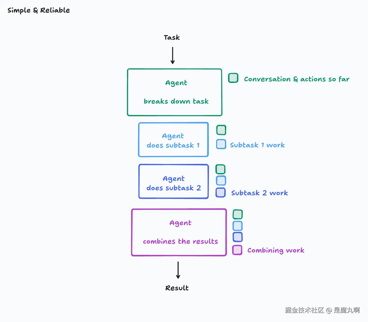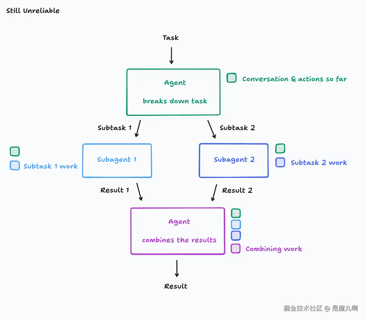 截至2025年6月,Claude Code 是一个产生子任务的 Agent 的例子。然而,它从不与子任务 Agent 并行工作,子任务 Agent 通常只被任务回答问题,而不是编写任何代码。为什么?子任务 Agent 缺乏来自主 Agent 的上下文,否则需要这些上下文来做任何超出回答明确定义问题的事情。如果他们要运行多个并行子智能体,他们可能会给出冲突的响应,导致我们在早期 Agent 例子中看到的可靠性问题。在这种情况下拥有子智能体的好处是,所有子智能体的调查工作不需要保留在主 Agent 的历史中,允许在用完上下文之前有更长的轨迹。Claude Code 的设计者采取了故意简单的方法。