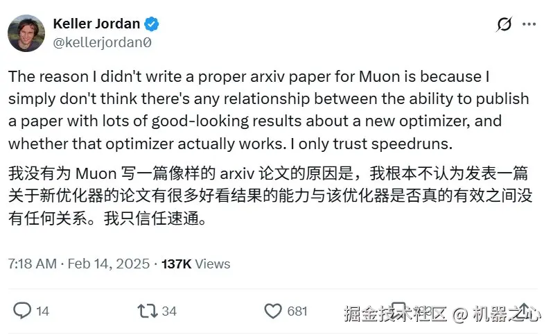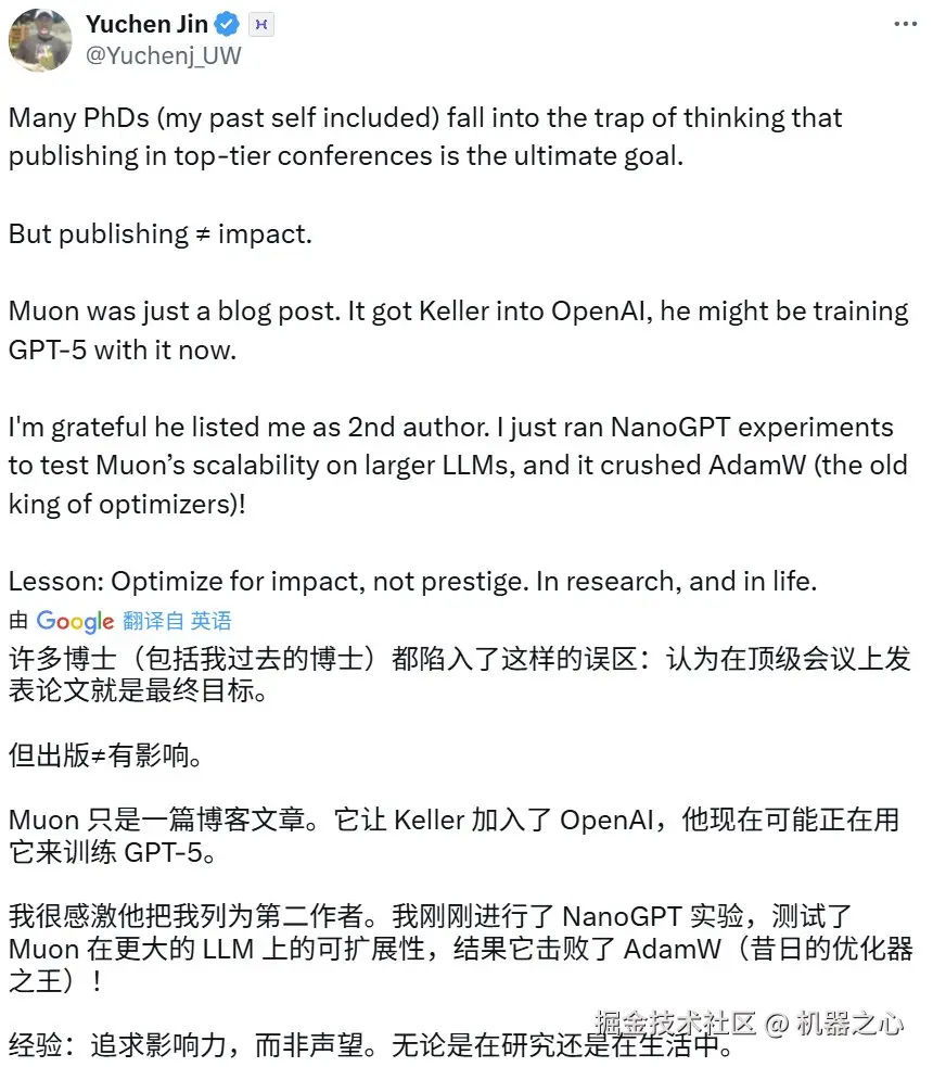 为何只发了博客,而不是发表一篇正式的 arXiv 论文,Keller Jordan 这样解释:能否发表一篇关于新优化器的论文,且包含大量看起来不错的结果,和这个优化器是否真的有效之间没有任何联系。「我只相信速通。」