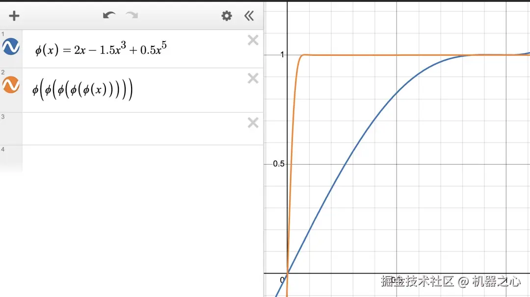为了满足当 N→∞ 时 φᴺ(x)→1,会有一定的自由度,因为 (a,b,c) 有很多符合此性质的可能选择。稍后我们将优化这个选择,但现在可在下图中看到,简单的基线 (a,b,c)=(2,−1.5,0.5) 已经有效。