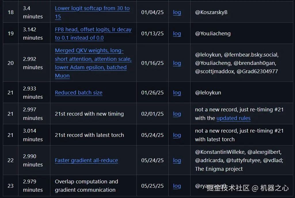 注意,这篇博客发表于 2024 年 12 月 8 日,因此其中对前沿指标的描述可能会略有过时,比如 NanoGPT 速通结果就已经被多次刷新了,下面展示了 Keller Jordan 托管的 NanoGPT 速通的最新八条世界记录,其中最新记录是今年 5 月 25 日创造的,已达到惊人的 2.979 分钟!当然,如此成绩不只靠 Muon,还有 FlexAttention、嵌入优化、架构优化等诸多改进。
