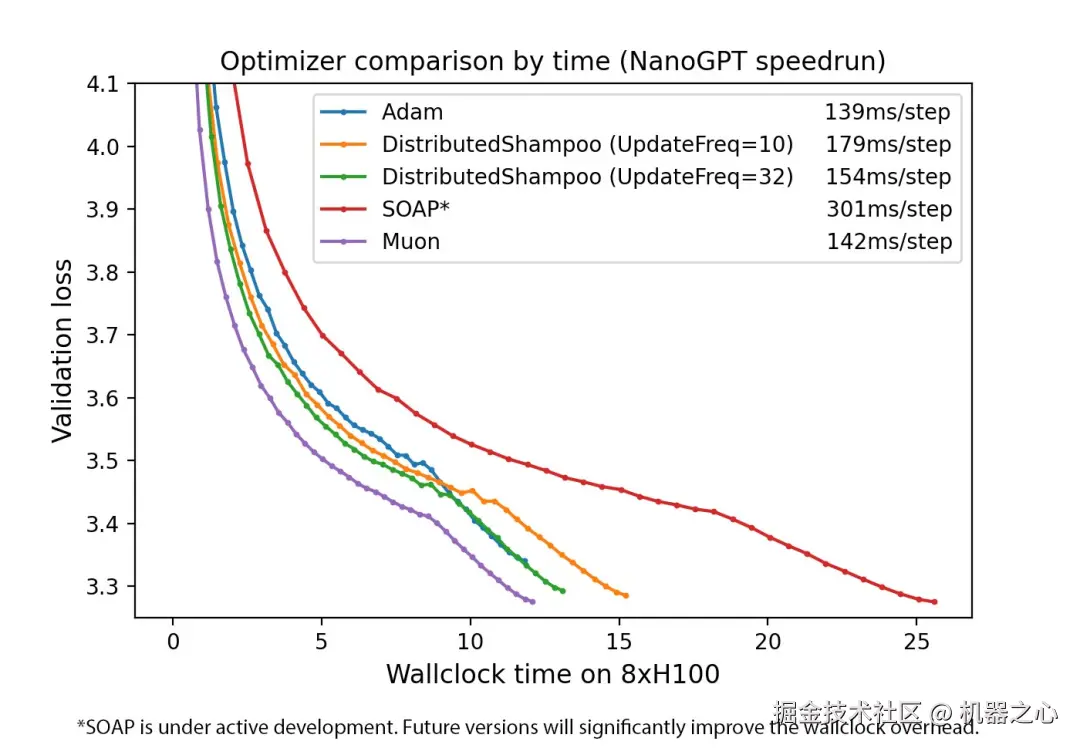 第三个结果是,如果将 Muon 分别应用于 Transformer 的 Q、K、V 参数,而不是同时应用于 Q、K、V 参数,则 Muon 在优化 Transformer 方面效果更佳,因为 Transformer 实现会将 Q、K、V 参数设置为单个线性层,并将输出拆分。