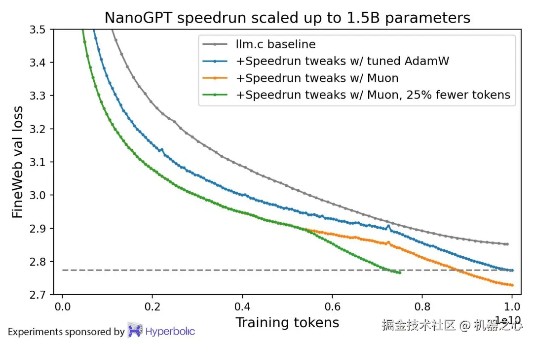 在 FineWeb(一项被称为 NanoGPT 竞速的竞赛任务)上的训练速度记录提升至 3.28 验证损失,提升了 1.35 倍。