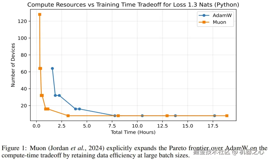 该论文表明,在计算 - 时间权衡方面,Muon 比 AdamW 更能显著扩展帕累托边界。他们发现,Muon 在保持大批量(远超所谓的临界批量)数据效率的同时,计算效率也更高,从而能够实现更经济的训练。
