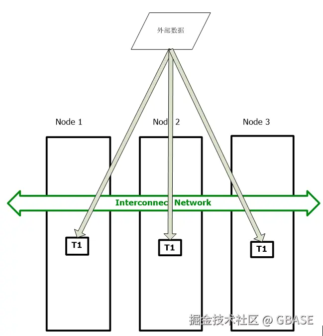 2、分布表的数据进行分片存储,采用(range、round robin, hash)等不同方式把数据进行拆分,拆分完毕后把数据存储到各个节点上,为了保证数据的高可用,分片后的数据也进行冗余的备份存储。例如T数据被分片成T1、T2,T3备份数据分别为T1'、T2',T3',每一个节点同时存储了另两个节点分片数据的备份数据。
