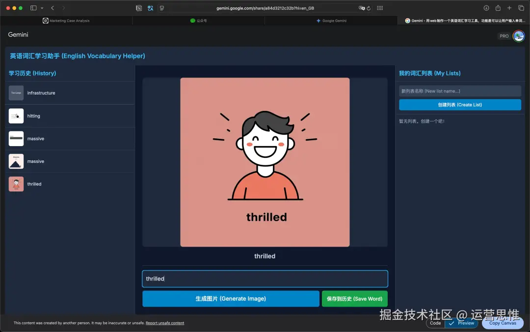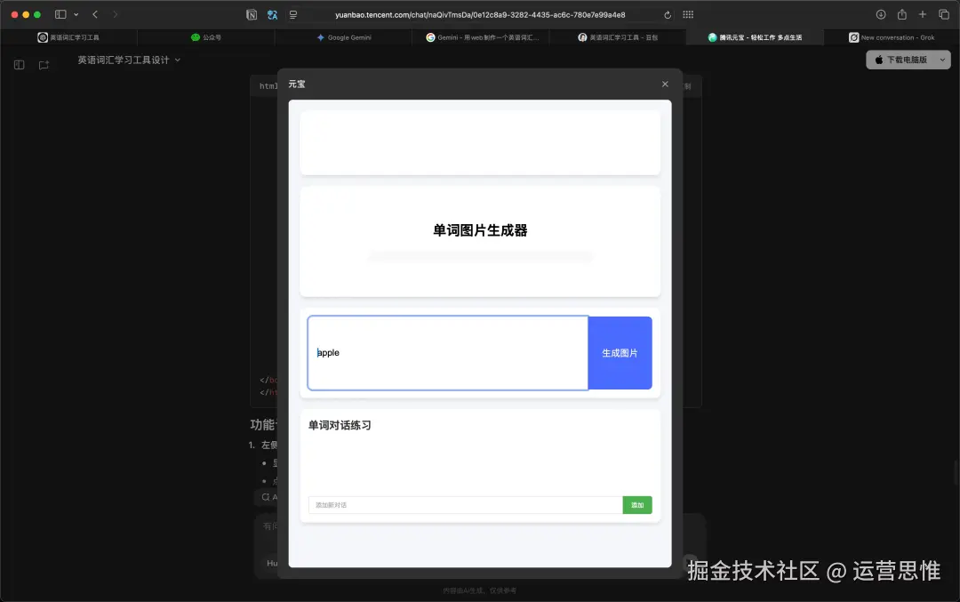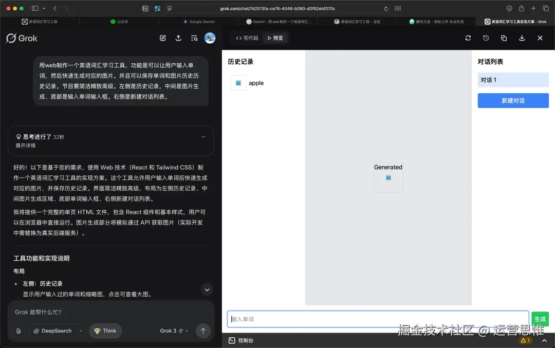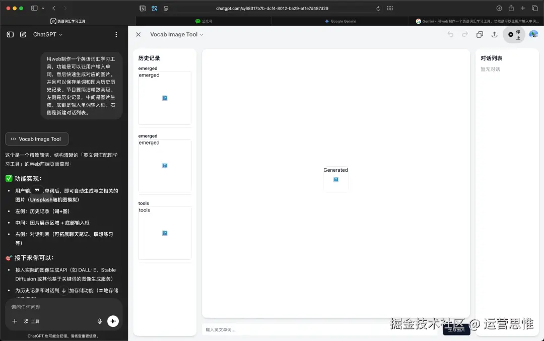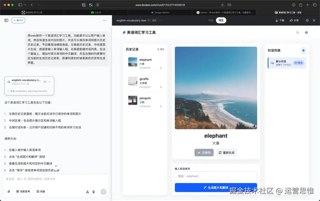 你告诉它:输入单词,生成图片,保存历史。它可能以为你在做个“图书馆查书系统”,然后给你生一大堆乱七八糟的文本逻辑,还不跑前端、不跑接口,根本没意识到你是要一站式的视觉化学习工具。