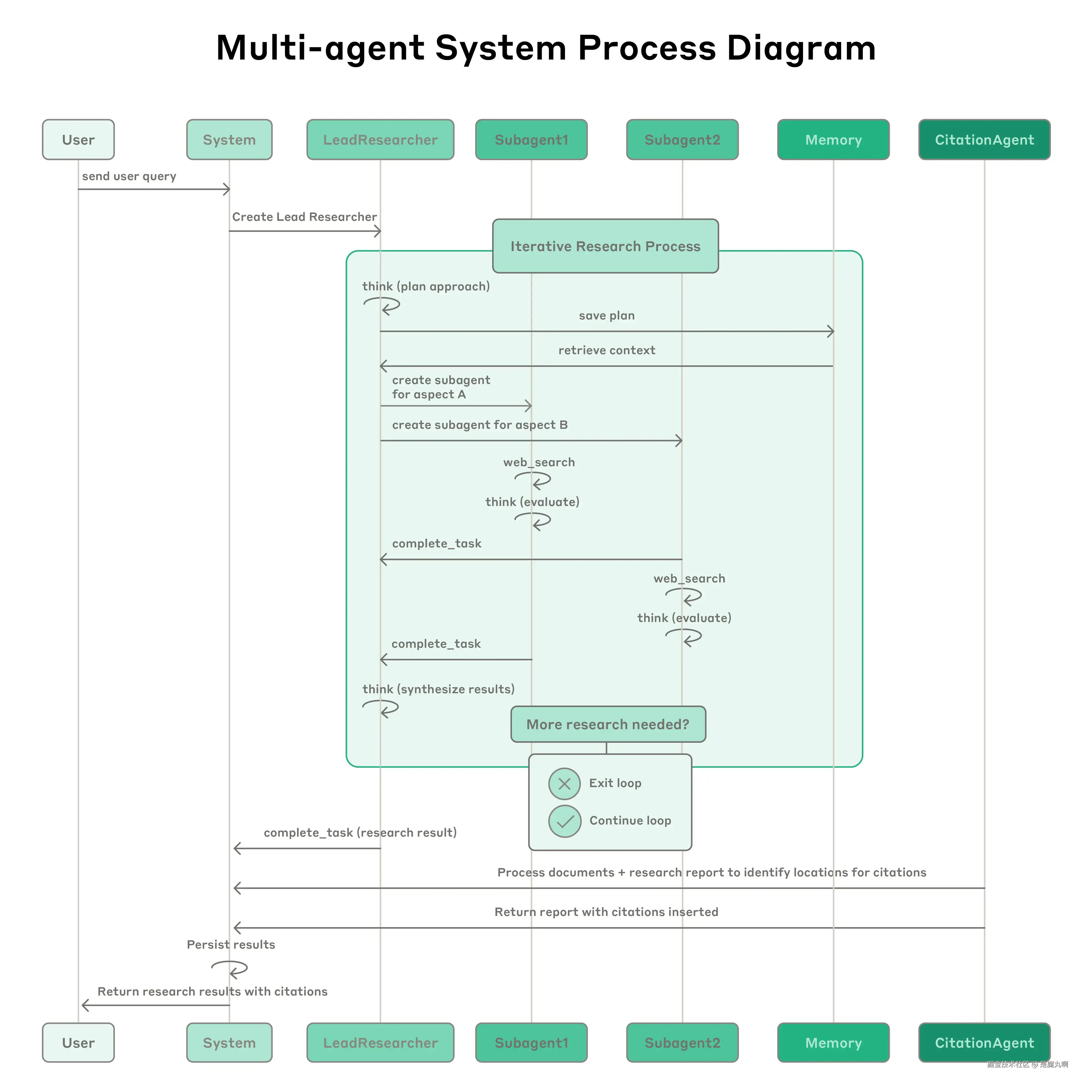 该流程图展示了我们的多智能体 Research 系统的完整工作流程。