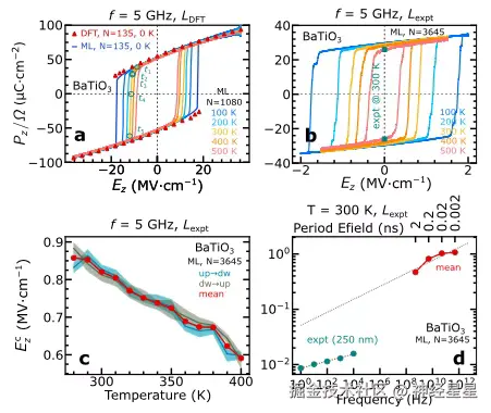 为进一步评估温度对铁电响应的影响,研究人员在 NVT 系综、 5 GHz 正弦变化电场下开展 MLMD 。研究发现,如上图 b-c 所示,随着温度升高,固有矫顽场减小,而自发极化受温度影响相对较小。 无论是在零温度还是有限温度下,滞回曲线均呈现出电场符号对称性,这符合极化保守矢量场的特性。此外,使用实验晶格参数的 3,645 个原子超胞进行研究时,自发极化与实验结果相符,矫顽场也更接近实验值,同时验证了模型在不同原子数和晶格参数超胞下的外推能力。
