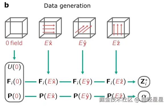 在训练数据的生成过程中, 如下图所示,研究人员在零电场周边区域,借助 DFT 计算进行数据获取,并运用有限差分近似方法来确定 Born 电荷以及极化率的相关数值。完成训练后,模型具备输出电焓的能力,进而通过对输出电焓进行一阶以及二阶导数的运算,推导出力、极化、 Born 电荷以及极化率等一系列关键参数。