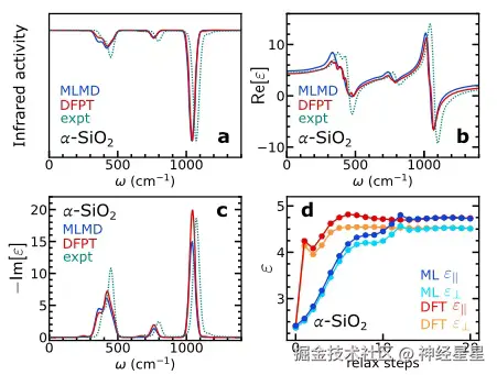 在振动和介电性质研究中, 研究人员选择 α−SiO₂ 作为典型研究对象,从经典势能的分子动力学模拟中提取了 72 个原子的 200 帧数据,并基于此训练出相应的机器学习模型。为深入探究模型的准确性,构建了含 24,696 个原子的超胞,在 NVE 系综下平衡 10 皮秒后,开展了 200 皮秒无电场的机器学习分子动力学(MLMD)模拟。通过极化动力学计算红外光谱,并分析极化和极化率动力学以确定频率依赖的介电常数,最终将结果与基于密度泛函微扰理论(DFPT)的计算结果及实验数据进行对比。