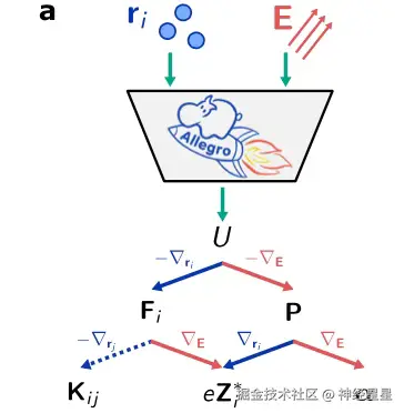 在模型架构的搭建过程中, 研究人员依托 Allegro 平台,充分利用等变神经网络所具备的高精度优势以及出众的数据效率, 同时,通过严格遵循局部性设计理念,实现了模型卓越的可拓展性。在模型的输入设计方面,如图所示,研究人员巧妙地将电场 E 与原子位置 r_i 进行融合,这使得模型得以同步开展对电焓 U 、力 F_i 、极化 P 、 Born 电荷 Z_i 以及极化率 α 的学习任务。