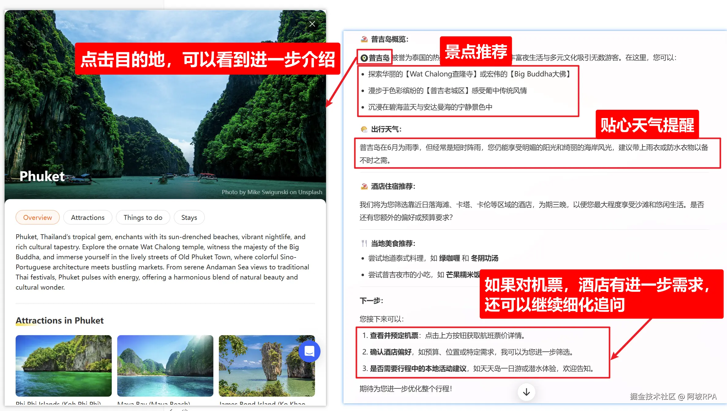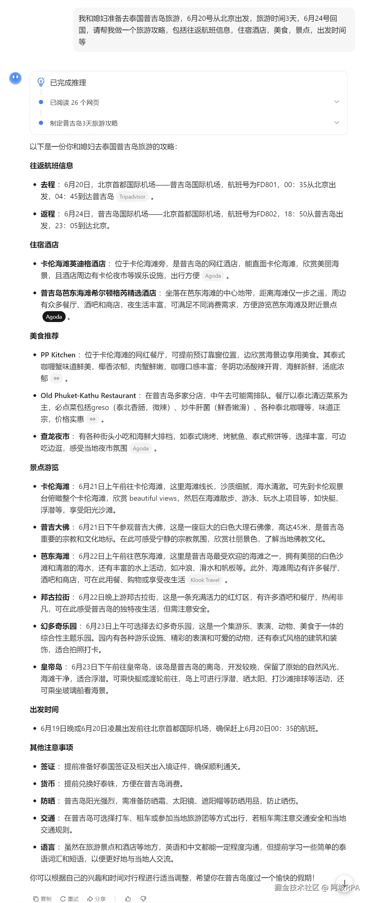 最近,正在琢磨去泰国普吉岛旅游一趟,我和媳妇开始提前搜资料,做攻略。平时我也不太注意旅行攻略,真到了需要的时候,其实我是一脸茫然的,不知道该从何查起。我们先直接问了AI: