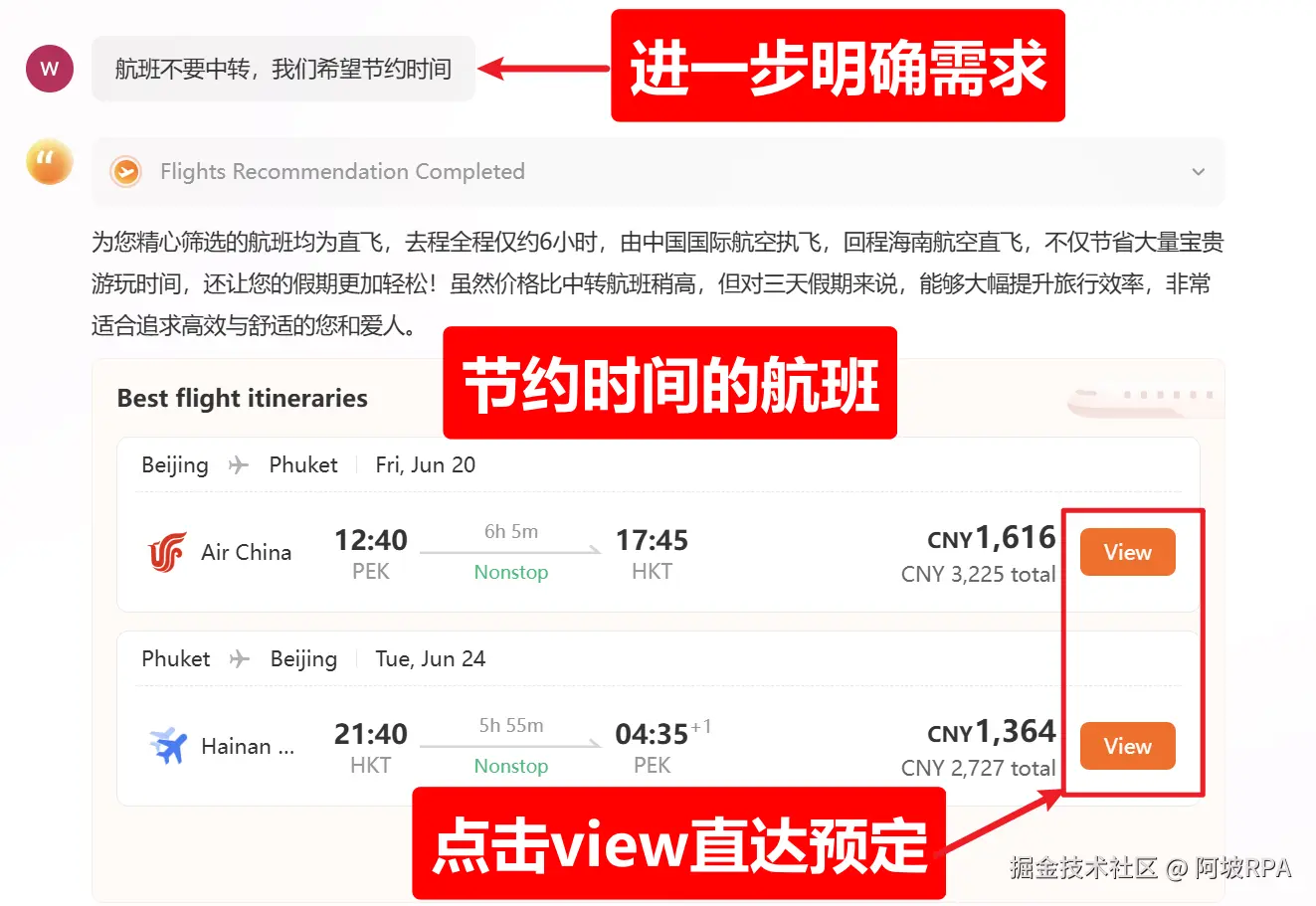 我想要节约时间,于是我继续跟他聊天,明确了我的进一步需求,这下推荐的航班时间,的确节约了不少: