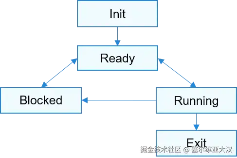进程创建或fork时,拿到该进程控制块后进入Init状态,处于进程初始化阶段,当进程初始化完成将进程插入调度队列,此时进程进入就绪状态。