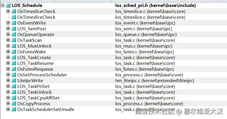 - Tick(时钟管理),类似于JAVA的定时任务,时间到了就触发。系统定时器是内核时间机制中最重要的一部分,它提供了一种周期性触发中断机制,即系统定时器以HZ(时钟节拍率)为频率自行触发时钟中断。当时钟中断发生时,内核就通过时钟中断处理程序OsTickHandler对其进行处理。鸿蒙内核默认是10ms触发一次,执行以下中断函数: