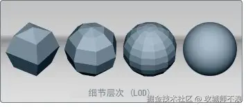 - LOD(Level of Detail):根据距离动态切换模型细节层级,如下图,视距越大,物体越模糊,三角面就越少,越近则越清晰,三角面越多。